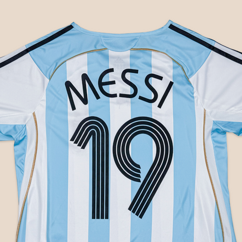 A camisa titular da Argentina na Copa do Mundo FIFA 2006, realizada na Alemanha, é um dos designs mais icônicos da Adidas e um símbolo da que é considerada uma das equipes mais talentosas que a Argentina já montou. O time contava com lendas como Juan Román Riquelme, Hernán Crespo, Javier Saviola, Ayala e, notavelmente, a primeira aparição de um promissor camisa 19: Lionel Messi.