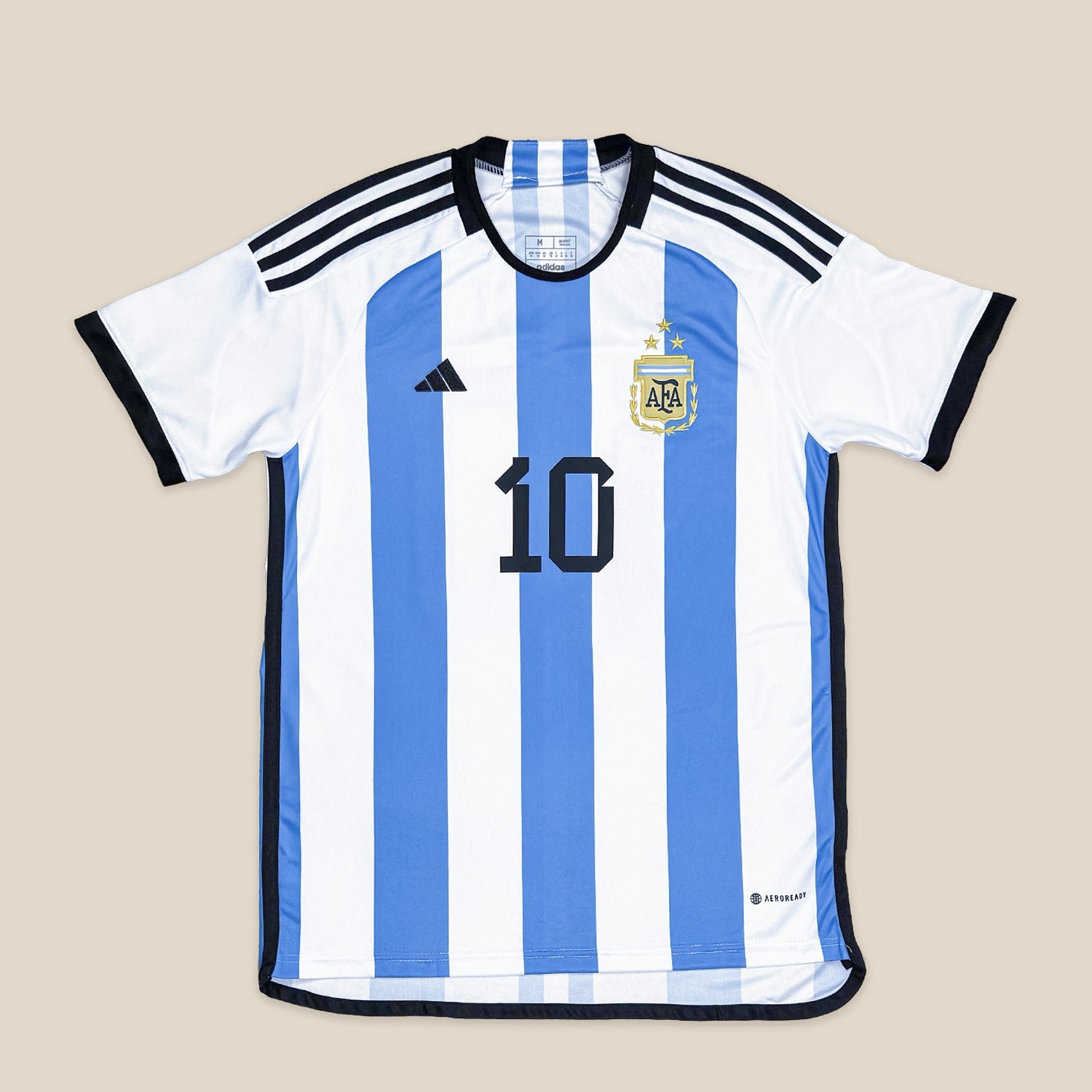 O Símbolo do Triunfo: A peça mais cobiçada é a versão pós-Copa, que incorpora as três estrelas douradas sobre o escudo da AFA e o Patch de Campeão Mundial da FIFA no peito. Vestir esta camisa é celebrar não apenas um time, mas uma jornada épica que terminou com um dos jogos finais mais emocionantes da história do futebol.