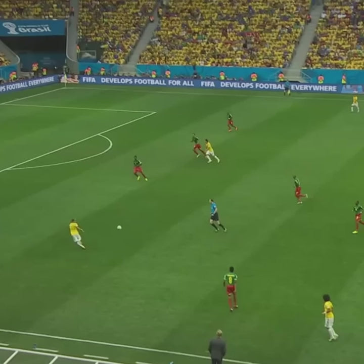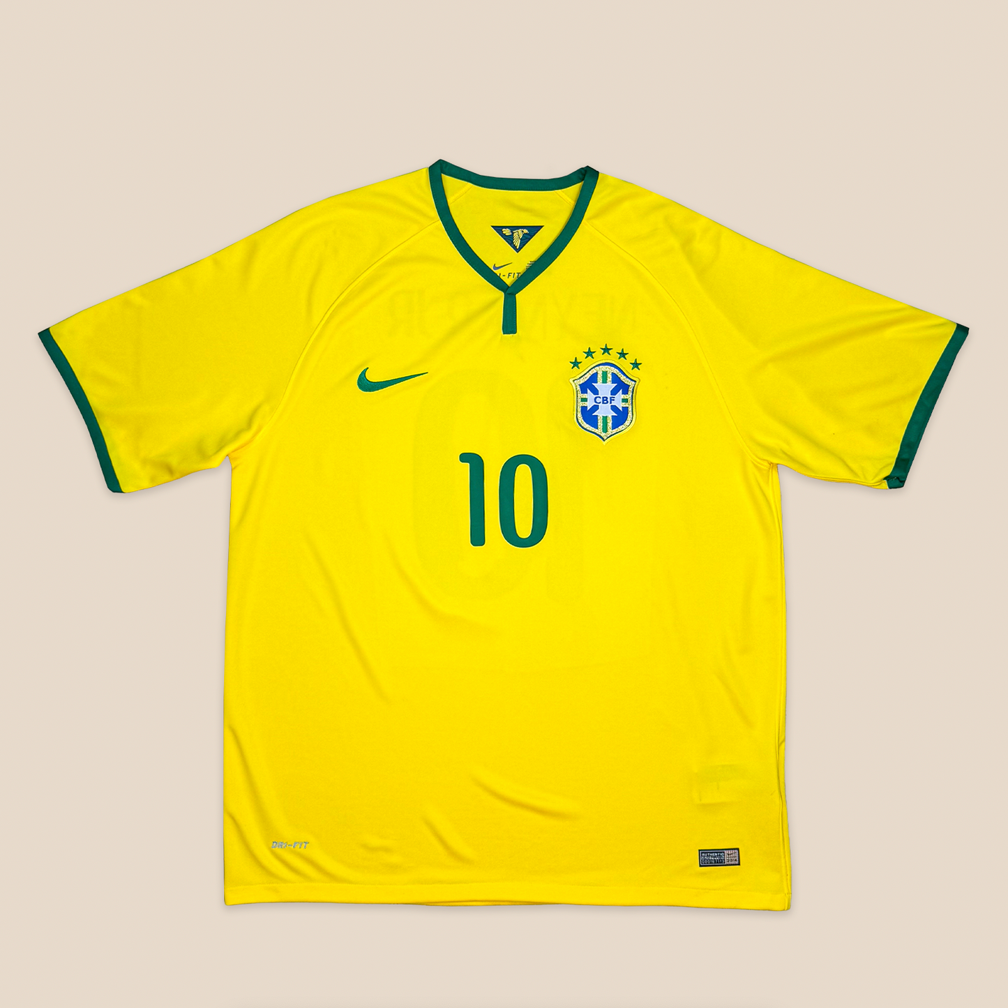 Design e Detalhes Culturais: A camisa de 2014 apresenta o amarelo canarinho vibrante, em um fit mais justo e atlético do que os modelos anteriores. O destaque é a gola em Y em verde, uma sugestão dos próprios jogadores para um visual moderno, mas despojado, que substituía o tradicional estilo polo. O escudo da CBF foi ampliado e ganhou uma costura em ouro metálico, conferindo um efeito reluzente para simbolizar o orgulho nacional.