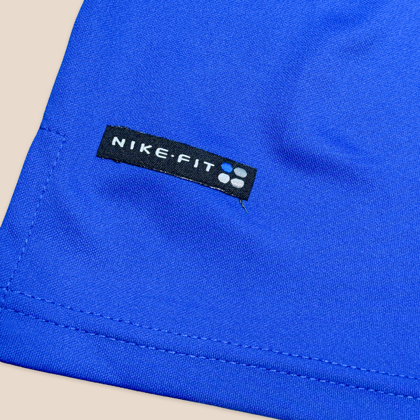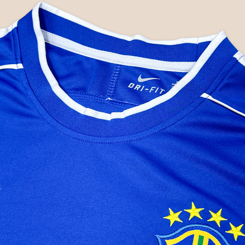 O Design Clássico-Moderno: Este uniforme é um dos favoritos dos colecionadores por seu visual limpo e elegante. O azul royal clássico do segundo uniforme brasileiro domina, contrastando com a gola redonda (careca) branca e os punhos que seguiam a mesma cor. O escudo da CBF, com as quatro estrelas reluzentes do Tetra, era bordado, e o Swoosh da Nike se destacava em branco. O modelo exibia uma faixa vertical sutil em jacquard, dando textura à peça.
