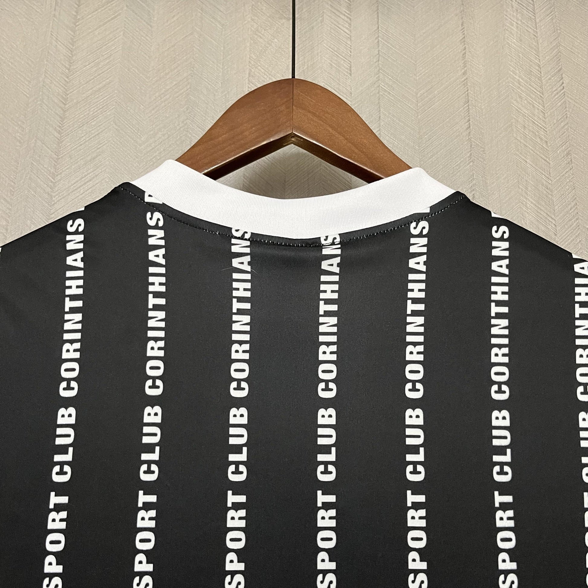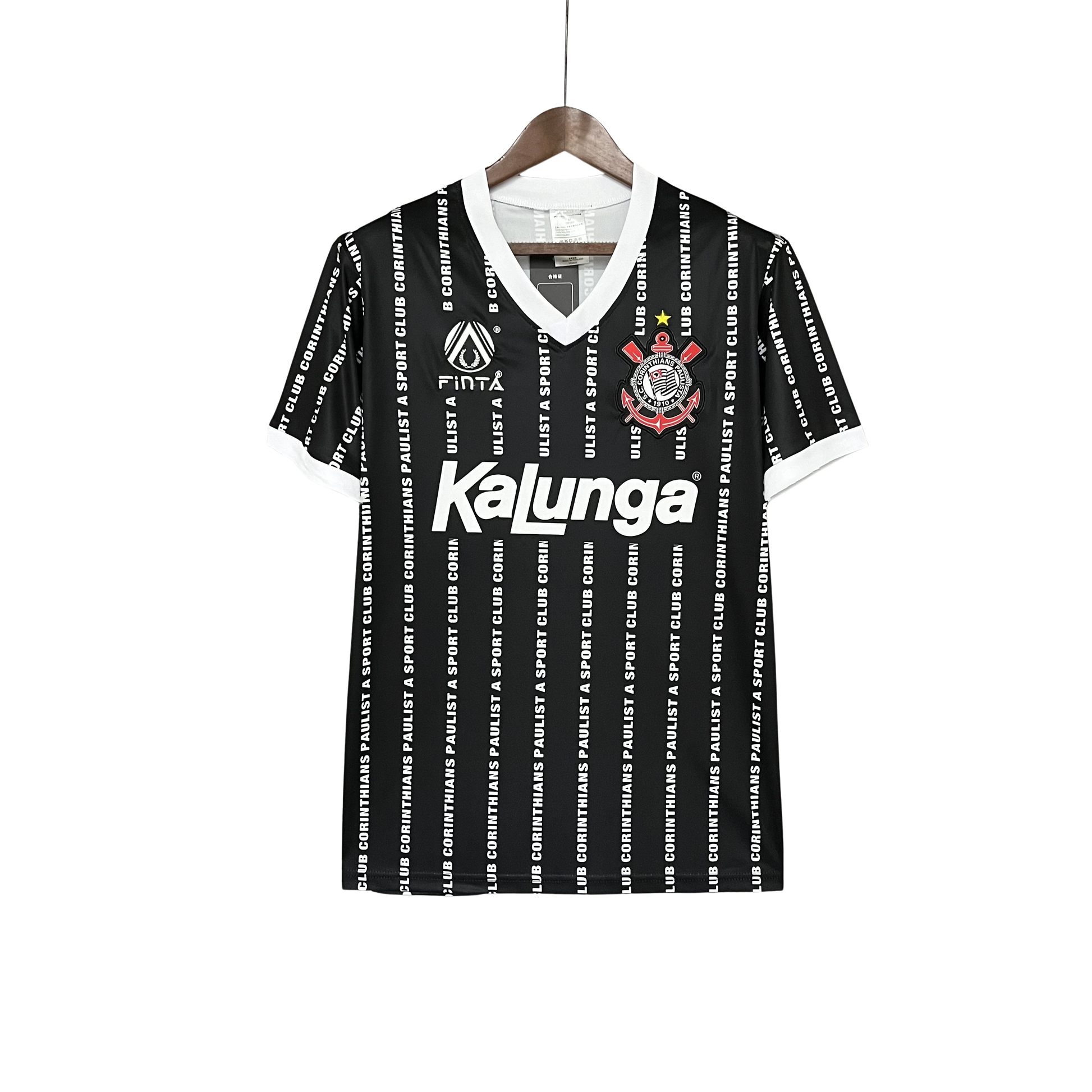 O design é marcado pelo preto sólido, com as tradicionais listras verticais em branco (ou, em alguns modelos, um tom de roxo/bordô sutil que remete à identidade). A camisa se destaca pela estética clássica dos anos 90, com a gola polo ou gola V. O escudo do Corinthians e o logo da Finta são aplicados no peito. O grande diferencial deste kit é a presença do patrocínio Kalunga (nas reedições), que foi o patrocinador máster do clube por anos, reforçando a nostalgia da época de craques como Viola e Ronaldo Giovanelli. Confeccionada em poliéster esportivo, a camisa oferece conforto e respirabilidade.