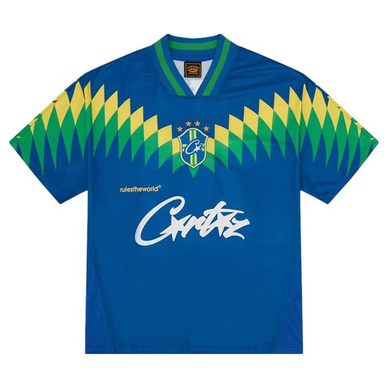 A short-sleeve jersey (camisa de manga curta) da marca de streetwear Corteiz (CRTZ) faz parte da linha "Rules The World". Este modelo é a versão alternativa (Azul) em homenagem à camisa da Seleção Brasileira de Futebol, incorporando a estética e a identidade visual única da marca.