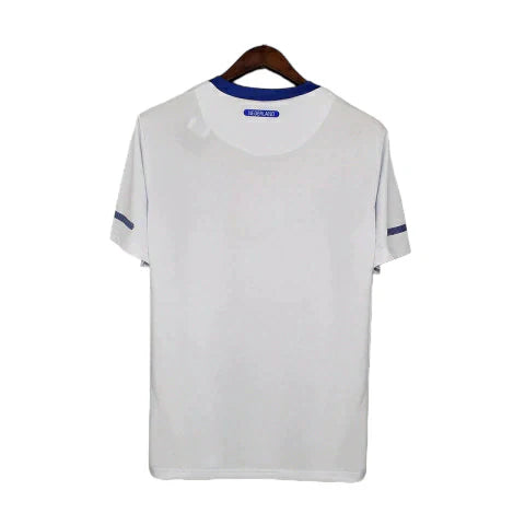 O design é marcado pela base branca pura e minimalista, que é complementada pelos detalhes nas cores da bandeira holandesa — vermelho e azul-marinho — que adicionam um toque sutil de patriotismo na gola e/ou nos punhos. A camisa possui o escudo da Holanda (KNVB) aplicado no peito e se beneficia da tecnologia de tecido Nike Dri-FIT (ou similar em reedições retrô), garantindo leveza e respirabilidade. É a escolha perfeita para o fã que busca um visual elegante que remete à era de craques como Robin van Persie e Arjen Robben.