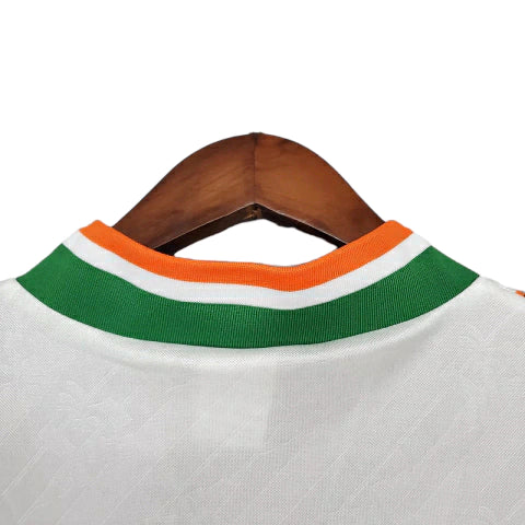 O design, assinado pela Adidas, é um clássico instantâneo da moda esportiva dos anos 90. Predominantemente Branca, a camisa se destaca pelo padrão gráfico de losangos (diamantes) em tons de verde e laranja que corre pelo ombro, um toque de design vibrante que remete às cores da bandeira nacional. Foi com este manto que heróis como Roy Keane, Paul McGrath, Ray Houghton e Packie Bonner fizeram história, conquistando uma vaga nas oitavas de final. Adquirir esta peça é carregar a memória da campanha americana, o espírito de luta irlandês e um dos designs mais elegantes e cobiçados daquela Copa do Mundo. É um item obrigatório para quem celebra a paixão do futebol celta.