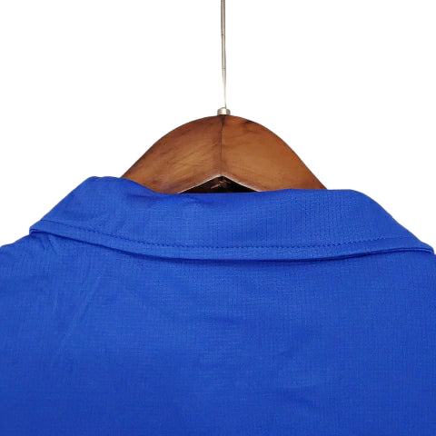 Cor principal Azul Royal com detalhes tricolore na gola e punhos (Uniforme Titular).