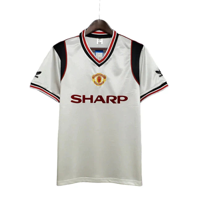 O design é um clássico atemporal da estética esportiva dos anos 80. Predominantemente branca, a camisa se destaca pelas icônicas três listras da Adidas nas mangas, aplicadas em preto e vermelho, cores que mantêm a identidade Red Devil de forma sutil. O uniforme apresenta uma gola V simples e contrastante, garantindo um visual limpo e sofisticado. Foi com este manto que o Manchester United, liderado pelo Capitão Bryan Robson e outros ídolos como Frank Stapleton, disputou as competições, exibindo a disciplina e o futebol rápido que marcavam a década. Adquirir esta peça é carregar a história da transição do clube, o charme nostálgico do patrocínio Sharp e um ícone de colecionador que exala a aura do futebol inglês dos anos 80. É um investimento obrigatório para o verdadeiro fã de uniformes clássicos.