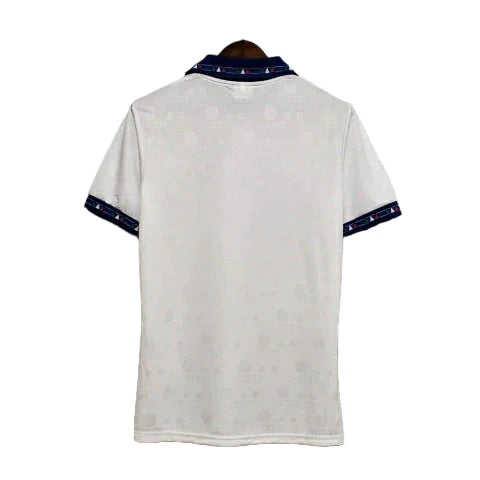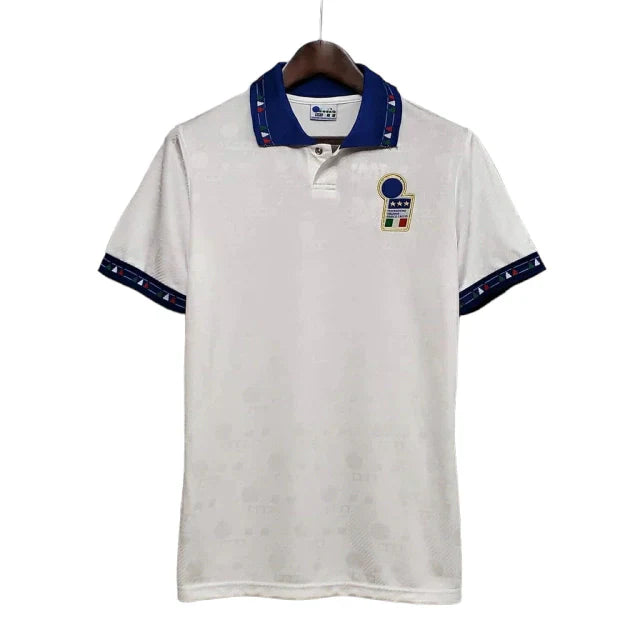 O design, assinado pela Diadora, é simples, porém elegante, no auge do estilo italiano. Predominantemente Branca, a camisa utiliza detalhes marcantes nas cores da bandeira. A gola polo em azul-marinho possui um detalhe elegante em tricolore (verde, branco e vermelho), que também aparece nos punhos. O grande destaque desta peça é a presença de Roberto Baggio, que a vestiu em momentos cruciais do torneio, incluindo a final em Los Angeles. Adquirir esta camisa é carregar a memória de uma das finais mais tensas da história, o talento e a cultura do Calcio e a elegância italiana que nunca se perde, mesmo na derrota. É um item obrigatório para quem celebra o futebol romântico e os grandes momentos de Baggio.