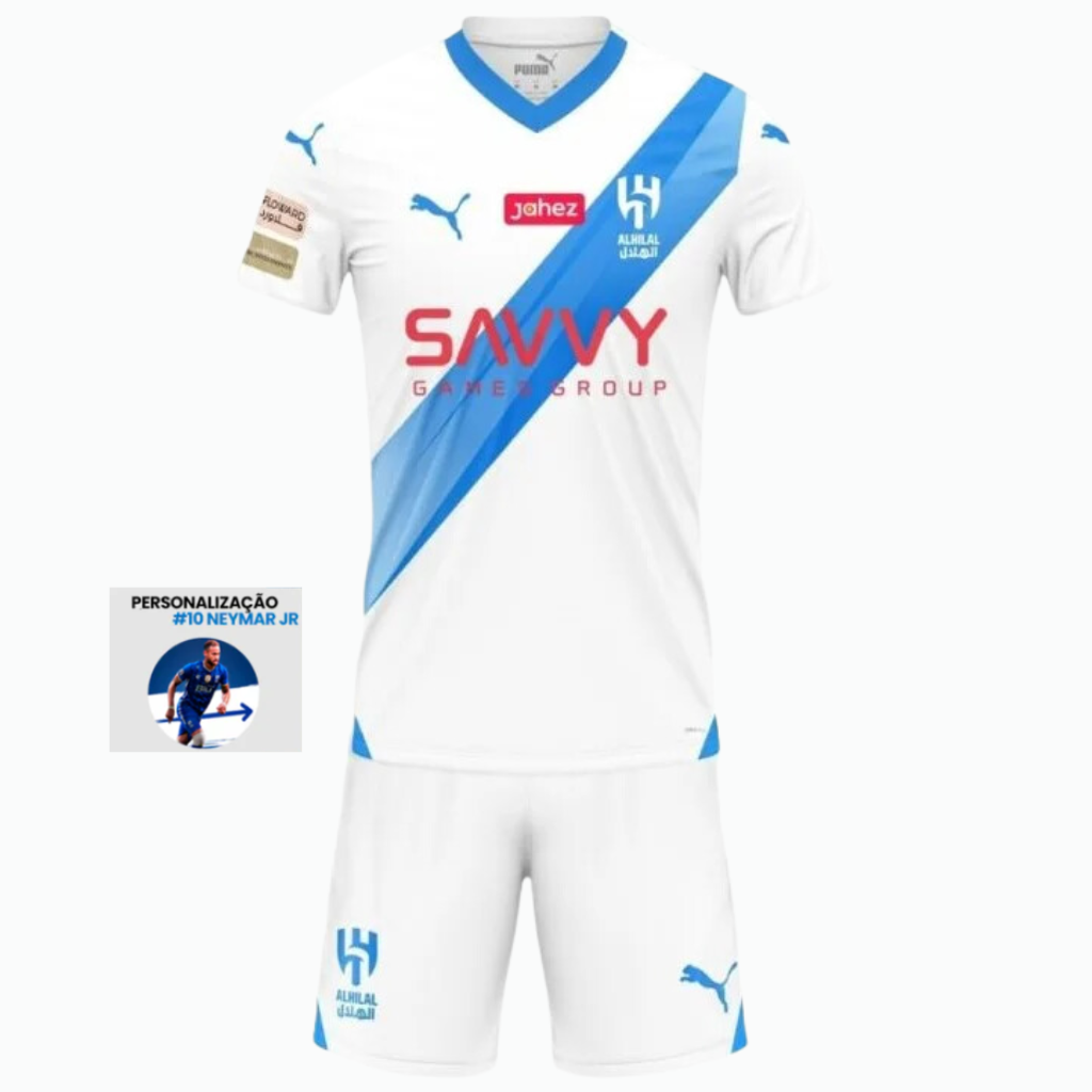 Este Conjunto infantil Al-Hilal 23/24 Reserva - Personalizada Neymar JR N° 10 - Puma é confeccionado em tecido 100% poliéster leve e resistente, que oferece muito conforto ao usar. Possui design moderno, que combina com o estilo do time e seu ídolo. Além disso, é perfeito para usar em qualquer ocasião, seja para treinos ou para torcer com estilo!