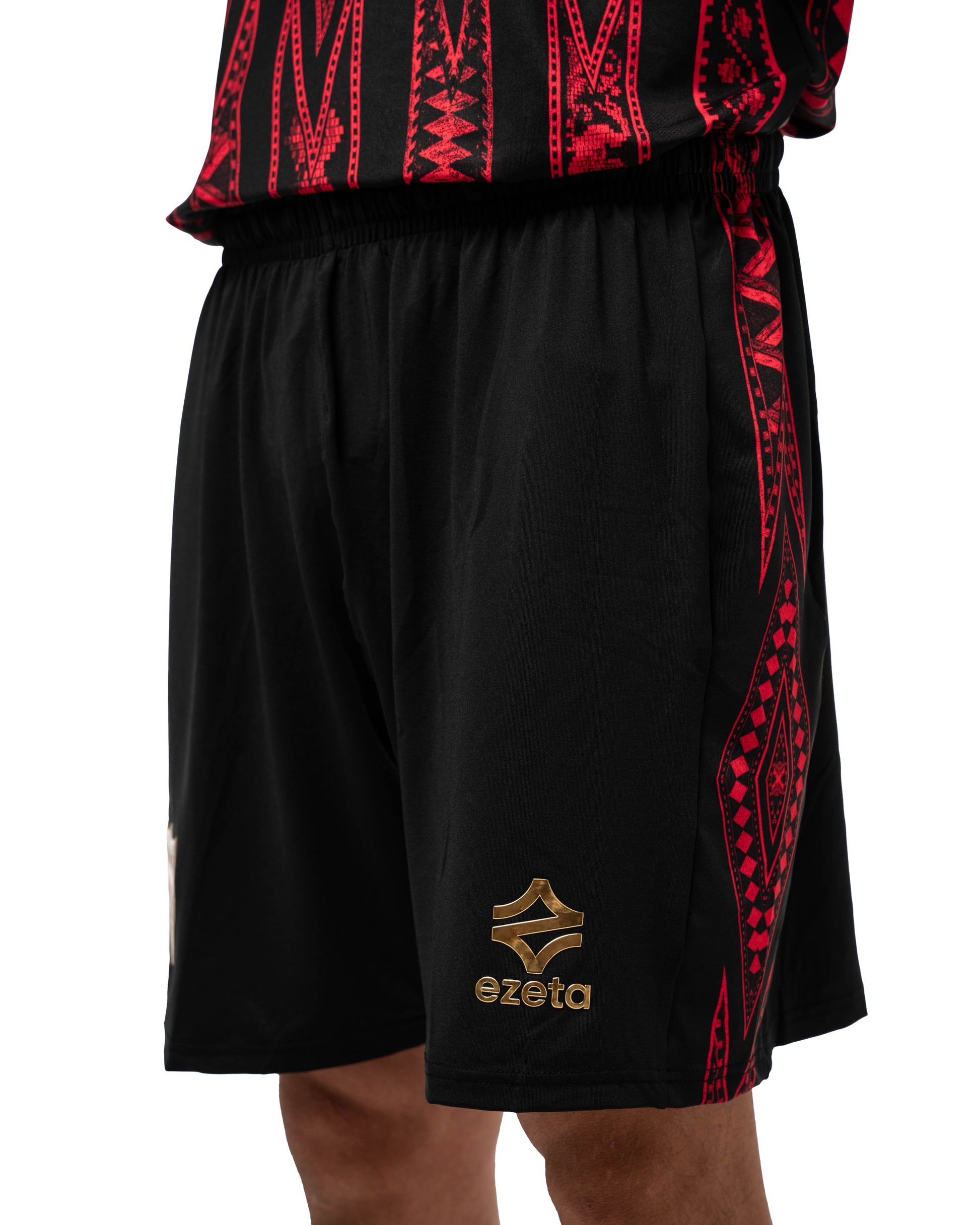 O padrão do shorts é inteiramente composto por pequenos fragmentos de mosaico em madeira, memórias que evocam o trabalho minucioso e artesanal dos artesãos locais.